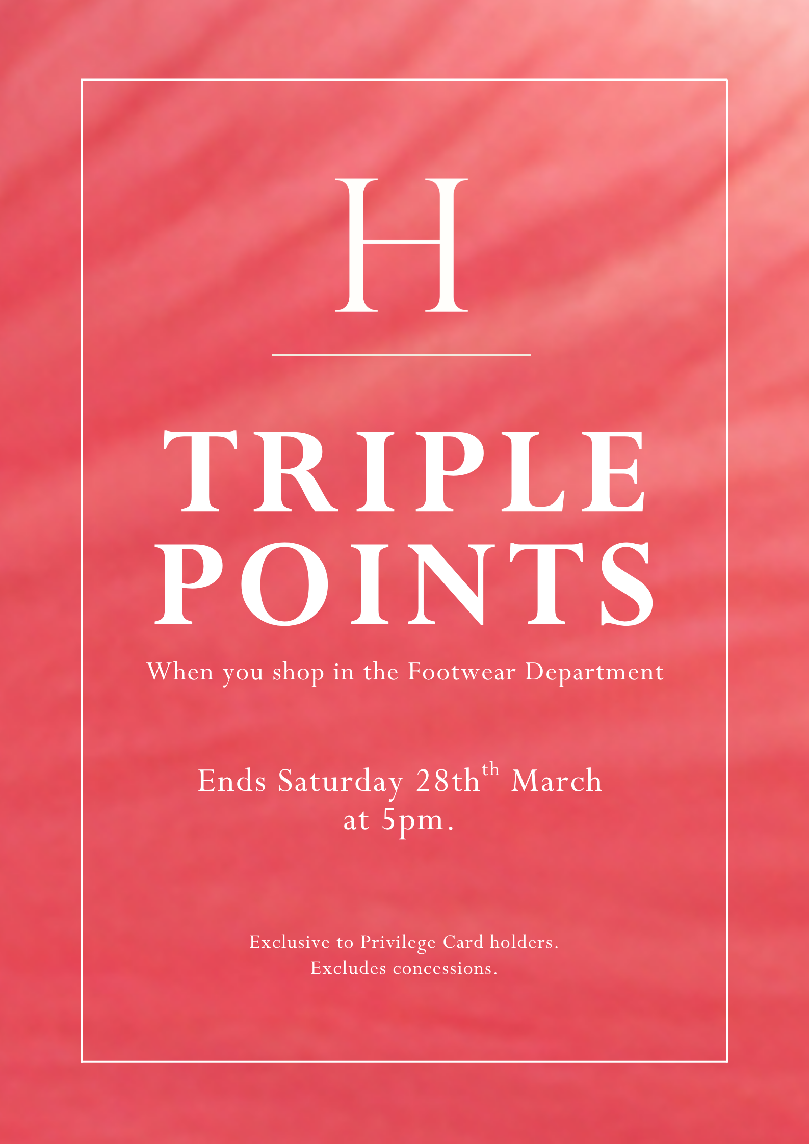 Privilege Card holders can get TRIPLE POINTS when they shop in the footwear department. Head on into store to enjoy, and step into the new season in style/